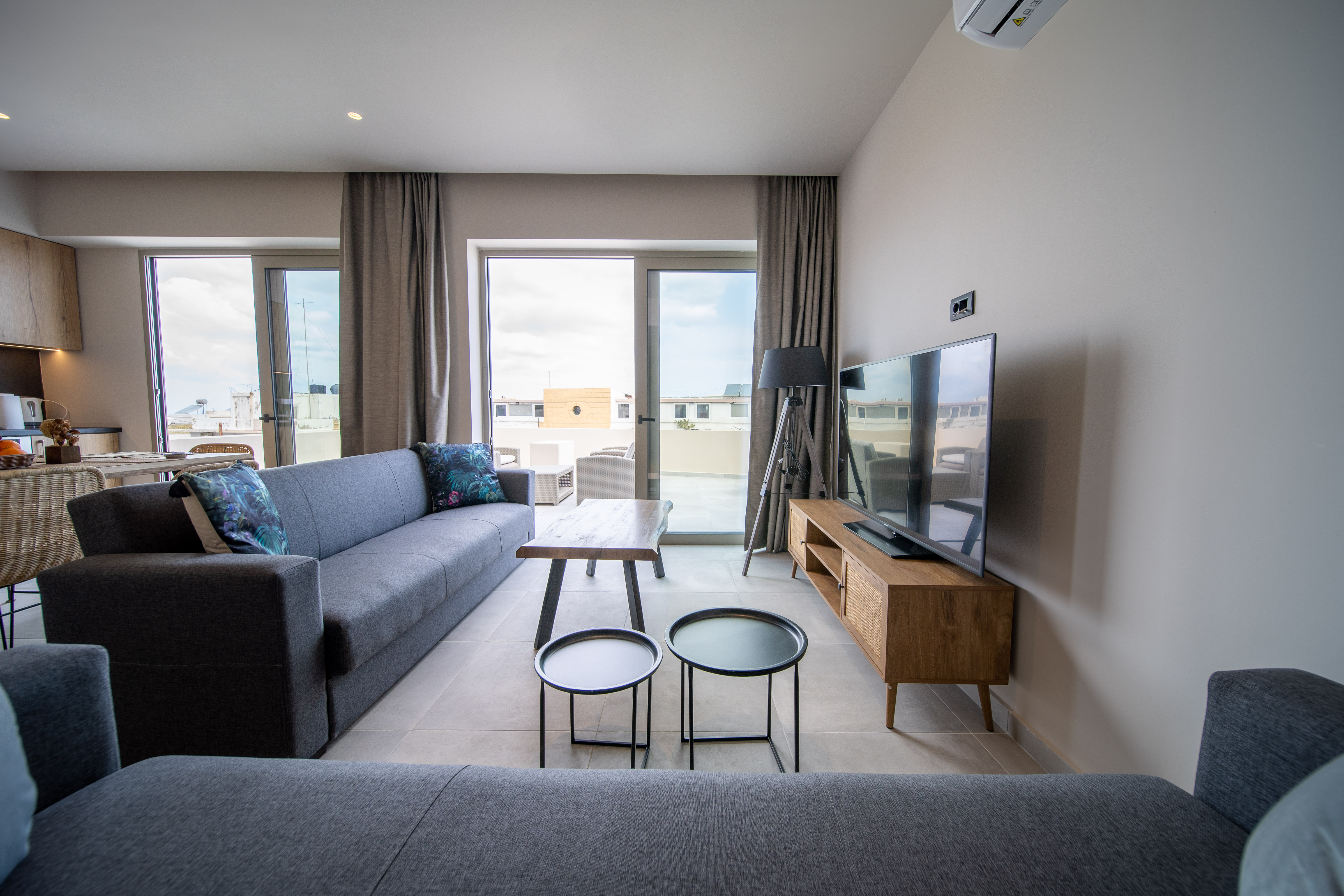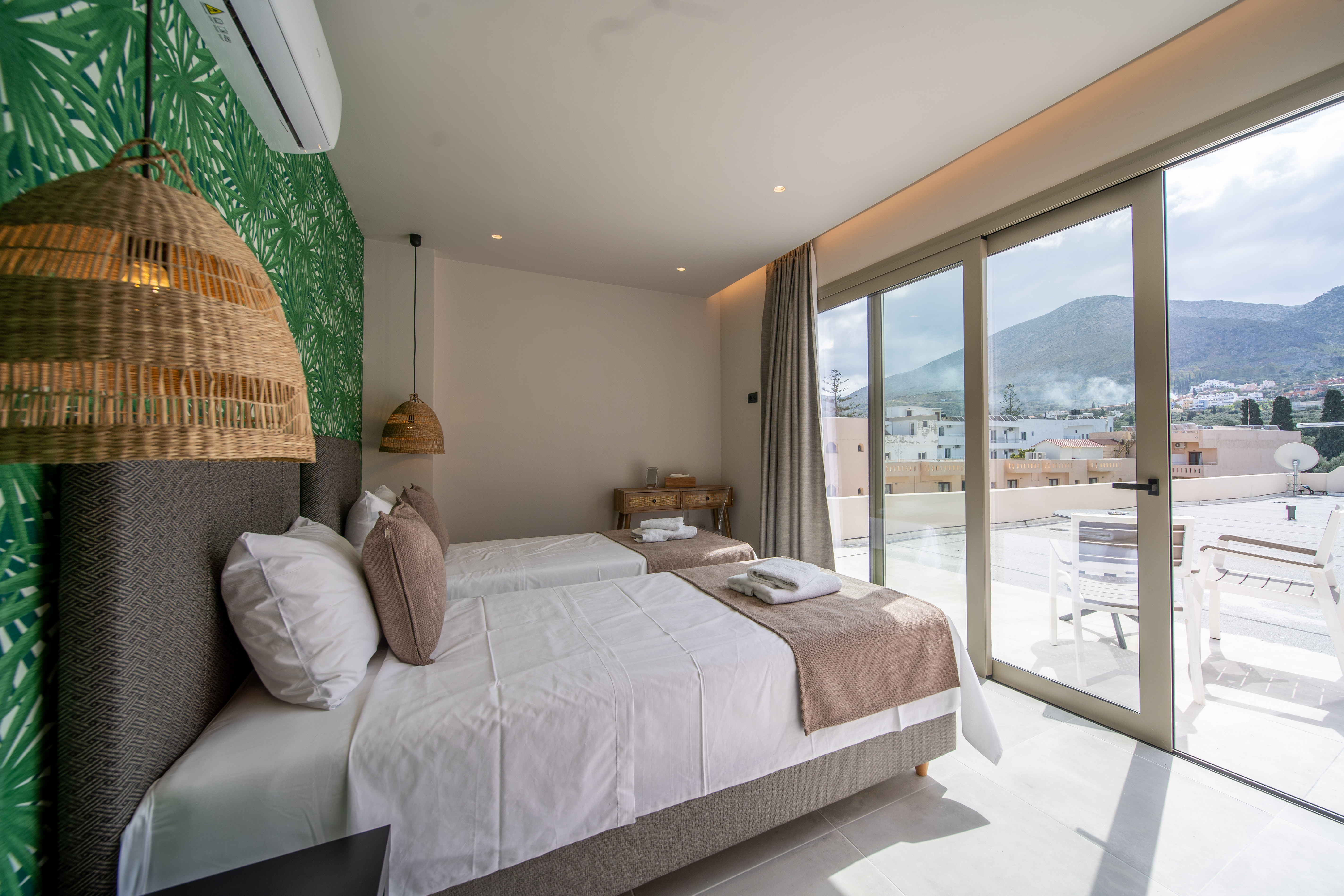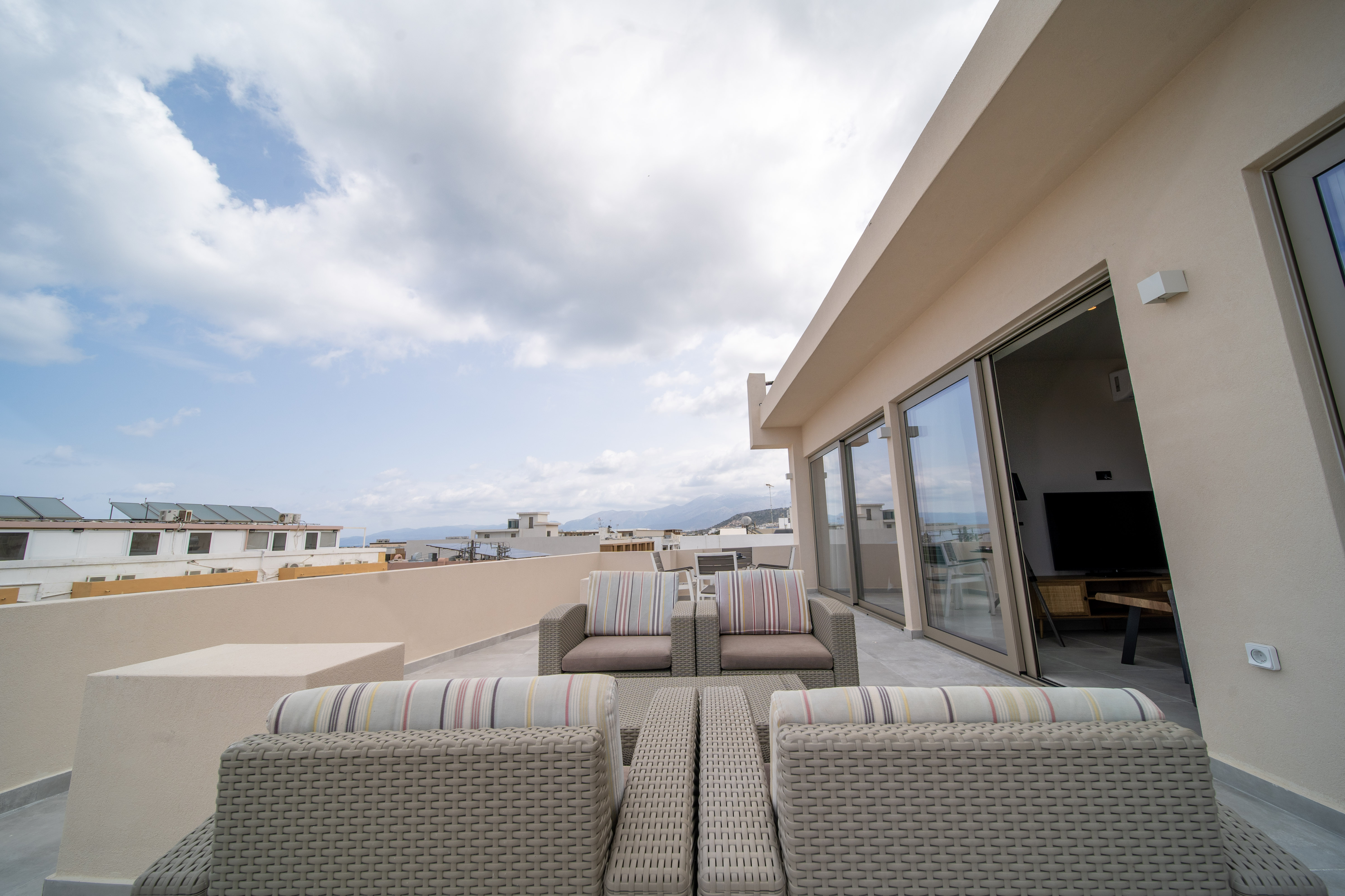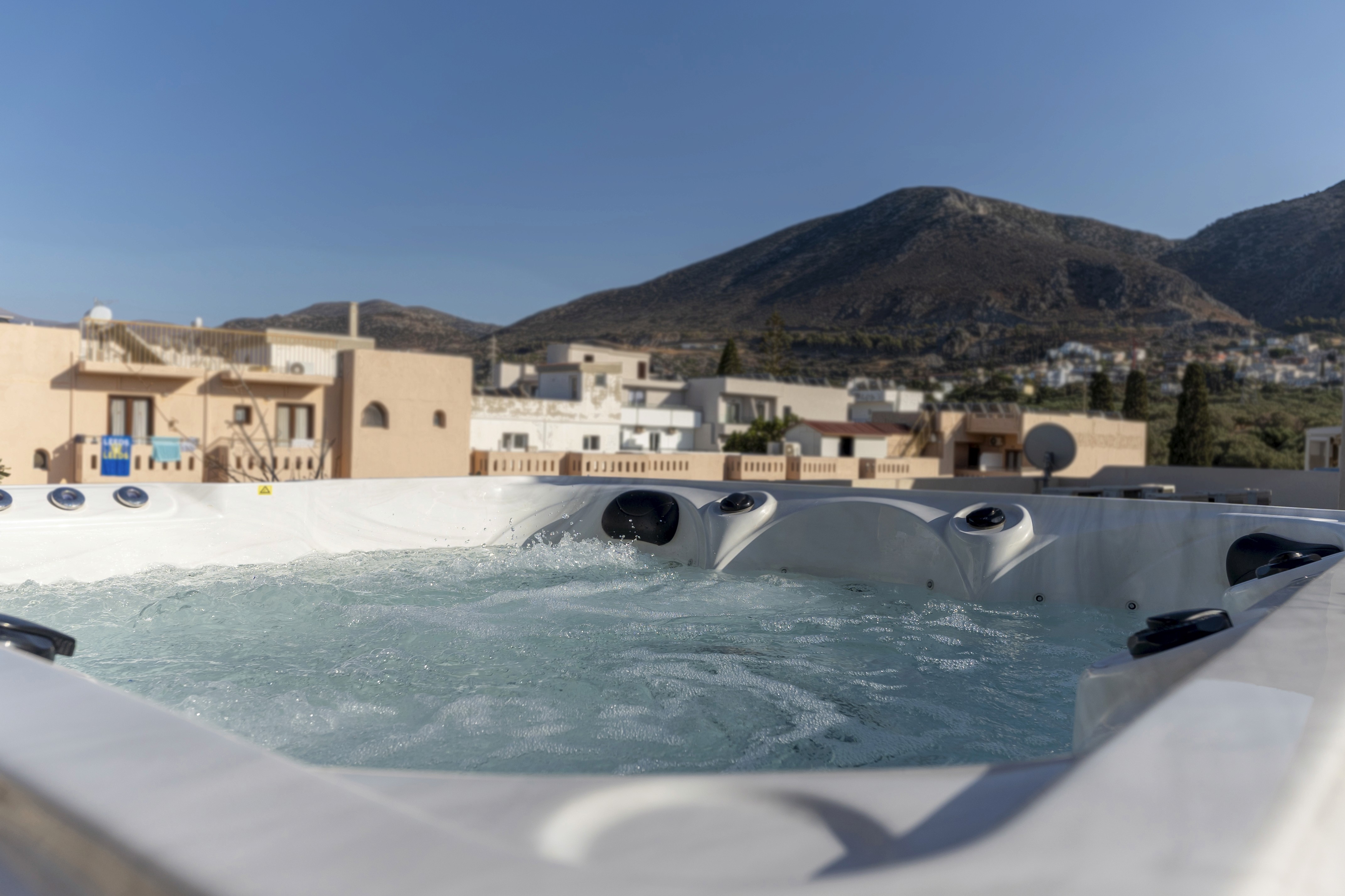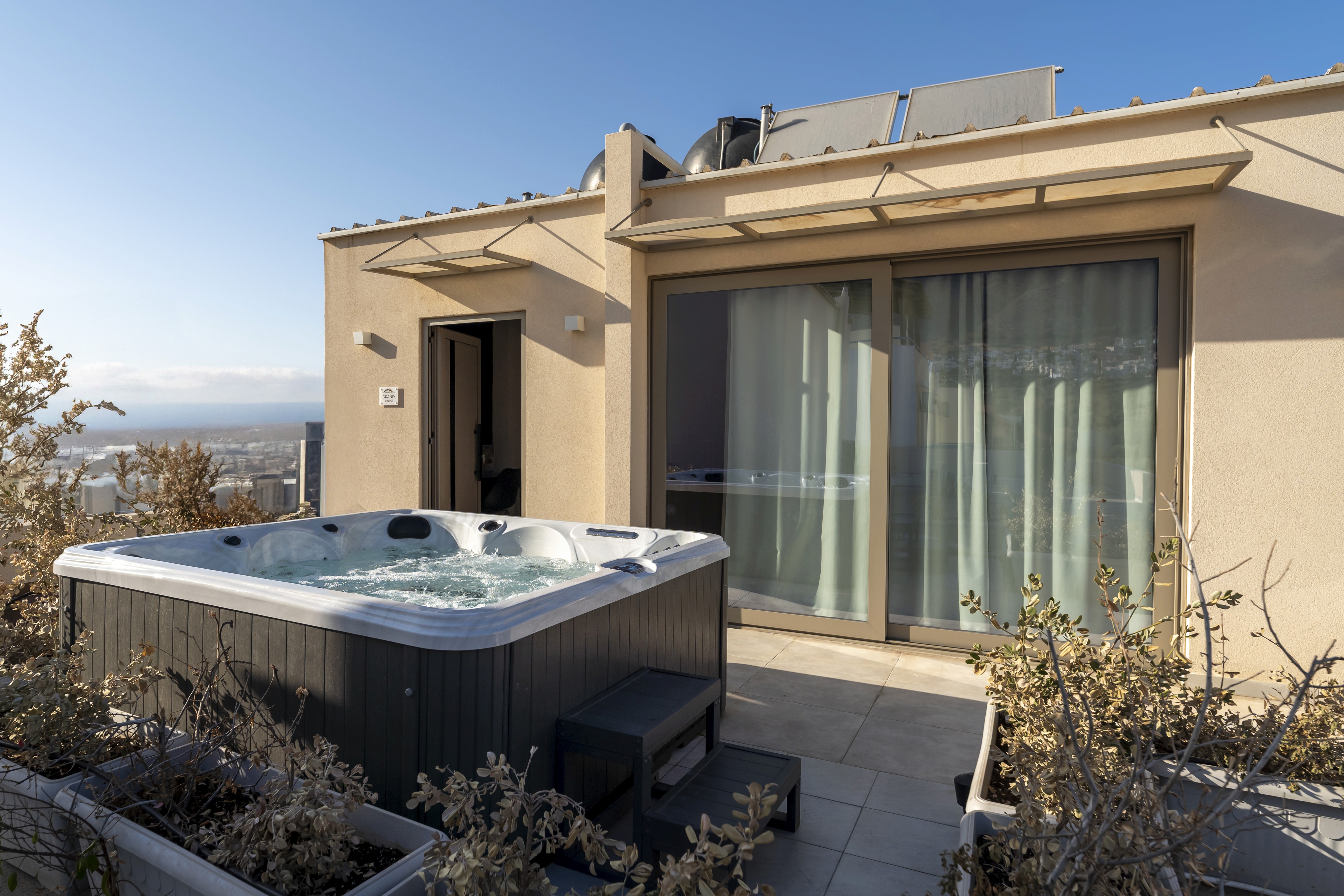 Grand House is a modern top-floor apartment in the center of Hersonissos, Crete, featuring a private outdoor jacuzzi and a spacious balcony with panoramic sea and city views. This stylish apartment offers two comfortable bedrooms, two modern bathrooms, a bright living and dining area, and a fully equipped kitchen. The large private terrace is perfect for relaxing, whether enjoying the sun during the day or unwinding in the jacuzzi under the stars. Amenities include air conditioning, Wi-Fi, elevator access, and all essentials for a comfortable stay. Located within walking distance of the beach, restaurants, shops, and nightlife, Grand House is ideal for couples, families, or friends seeking a premium stay in a central location.